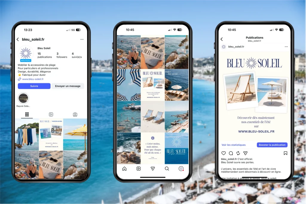 L’identité visuelle puise son inspiration dans les nuances de la mer et du sable, avec une palette articulée autour du « Bleu Signature » et du « Sable Clair ». Le logo et la charte graphique ont été pensés pour évoquer le calme et la sophistication, utilisant une Serif raffinée pour l’élégance et une Sans Serif moderne pour la lisibilité. L’univers graphique utilise des formats type « polaroid » pour renforcer la dimension émotionnelle et lifestyle de la marque.