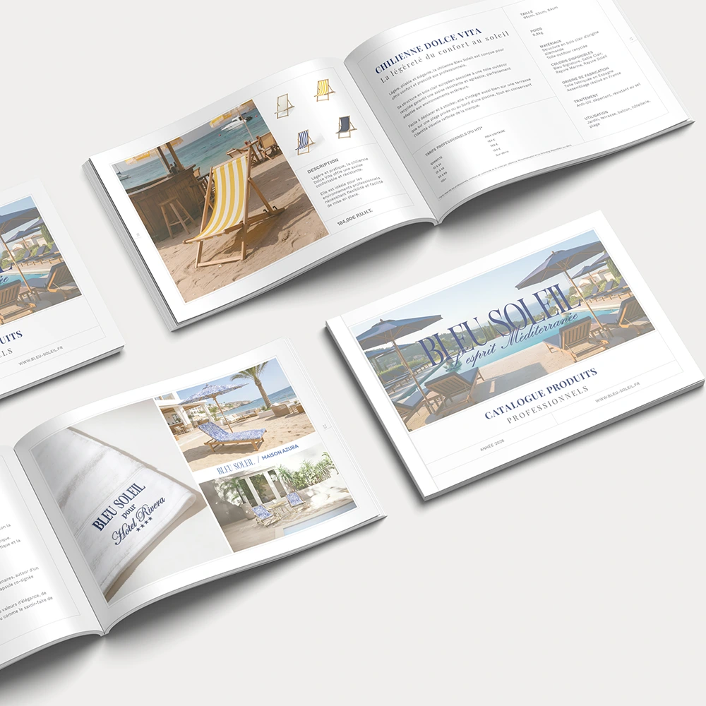 Pour soutenir la démarche commerciale B2B, j’ai conçu un catalogue professionnel de 28 pages sur InDesign. Ce support présente de manière structurée les collections, les caractéristiques techniques des matériaux et les options de personnalisation. La mise en page respecte rigoureusement les contraintes techniques d’impression (fonds perdus, CMJN) pour garantir un rendu final haut de gamme.
