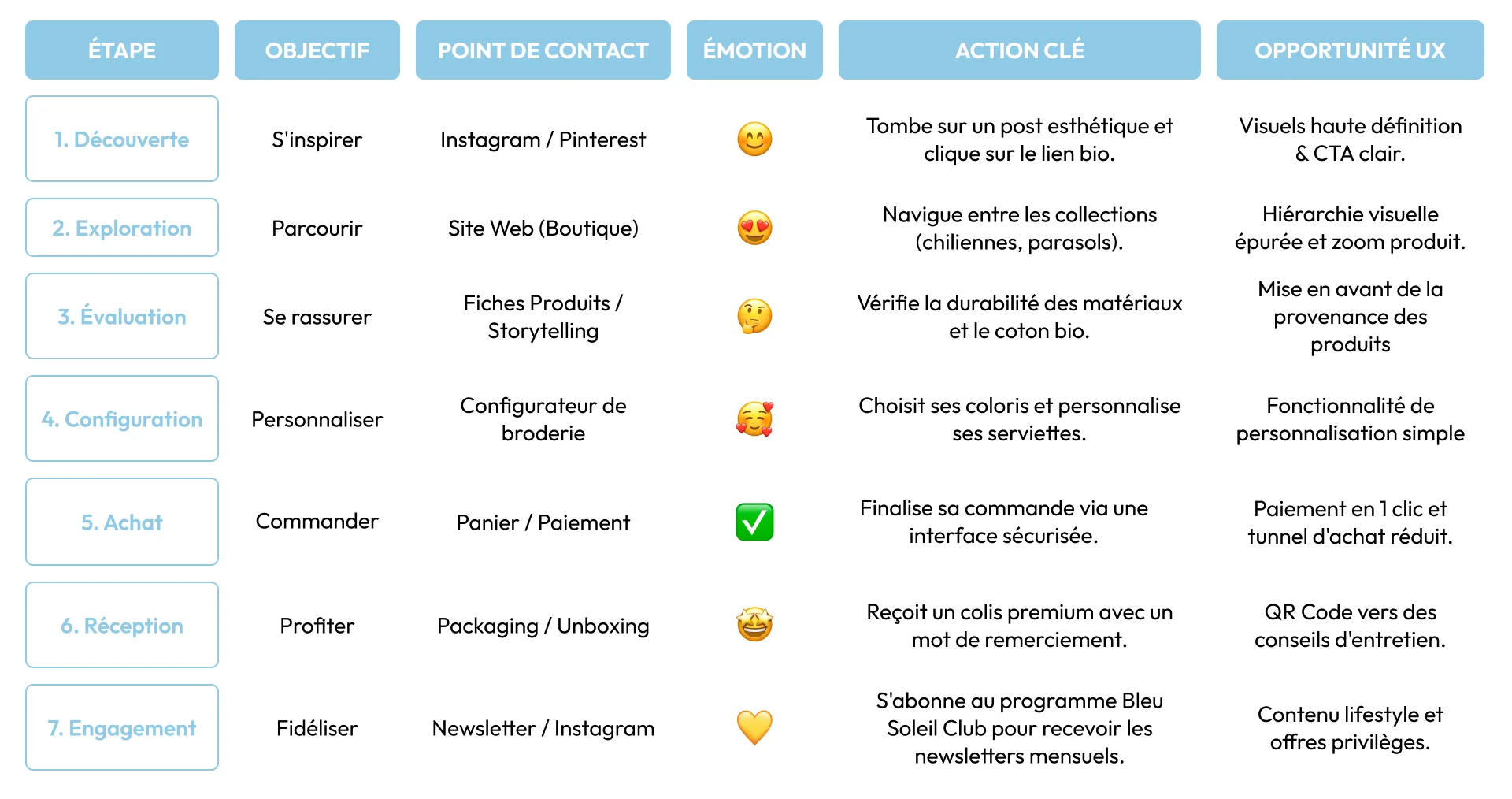 La stratégie repose sur le concept du « quiet luxury », ciblant des particuliers en quête de raffinement et des professionnels de l’hôtellerie. J’ai développé des proto-personas précis pour modéliser des parcours utilisateurs adaptés. Cette phase a permis de définir une promesse forte : offrir une expérience balnéaire authentique grâce à des produits éco-responsables et durables.